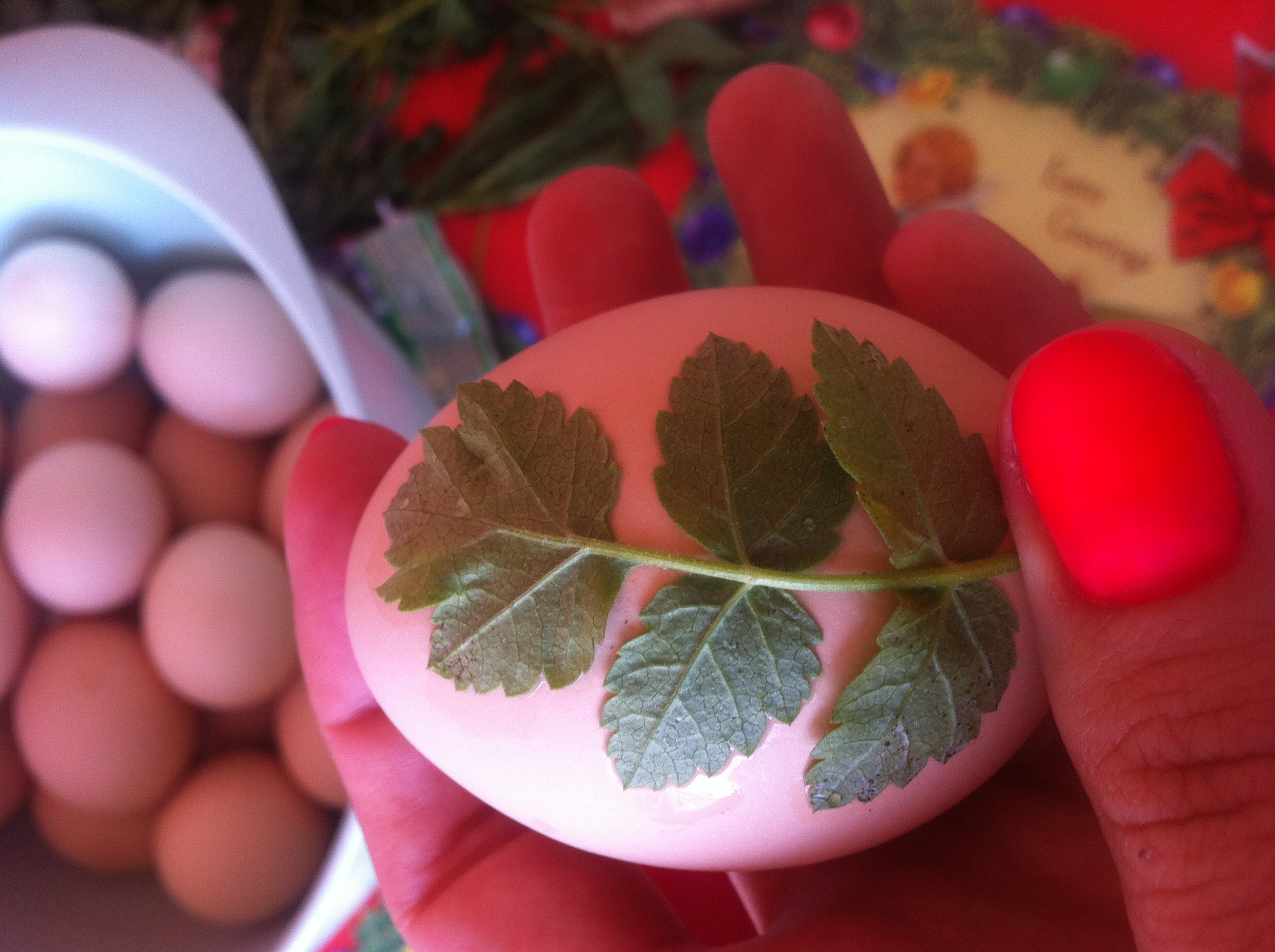 Încondeiatul ouălor e munca „vestalilor”, a tatei şi a mea: adunarea plantelor pentru decorare este însoţită întotdeauna de povestea copilăriei lui, de dealurile verzi şi frumuseţea locului natal, dozarea perfectă a cojilor de ceapă pentru nuanţa perfectă de roşu se face pe fundalul zgomotos de râsete şi voie bună. Încă din cratiţă, îmi aleg oul invincibil care va avea să rămână intact în urmă tradiţiei „ciocănitului ouălor”.
