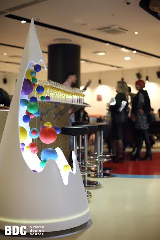 Este vorba de o creaţie ultra-contemporană, realizată din corian alb, în interiorul căruia sunt suspendate globuri multicolore.