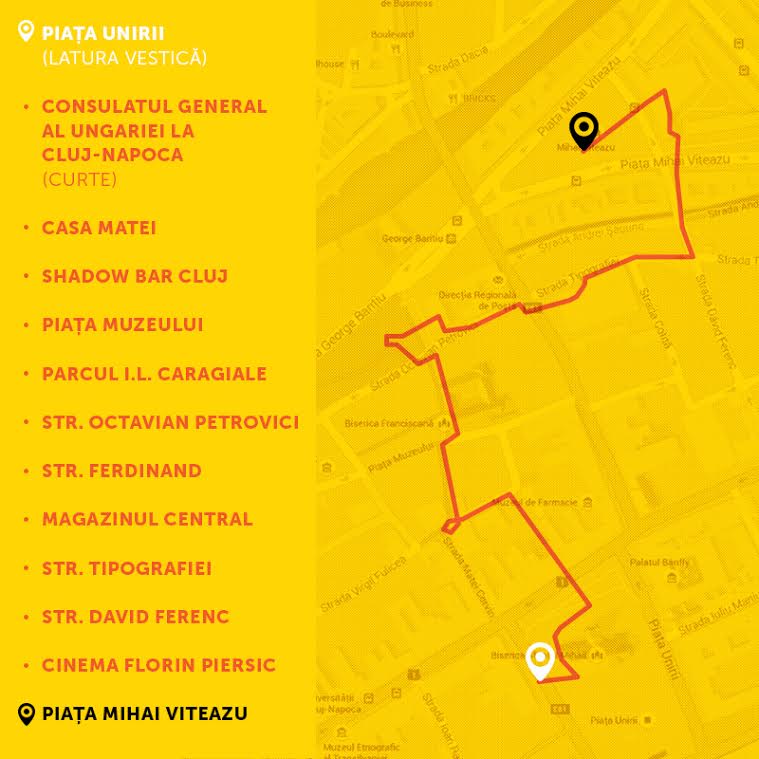 Un șir de piese de domino format din câteva mii de cărămizi parcurge diferite spații ale orașului: străzi, parcuri, clădiri și piețe. Piesele de domino se înlănțuiesc într-o mișcare dinamică, tip cauză-efect, întreruptă uneori pentru momente performative sau mici ritualuri urbane, pentru a conecta fizic și simbolic diferitele spații și comunități ale orașului. Prima cărămidă cade sâmbătă la ora 17:00, iar șirul de domino va începe în Piața Unirii (latura vestică) și va traversa curtea Consulatului General al Ungariei la Cluj-Napoca, va trece pe lângă Casa Matei, prin Shadow Bar, Piața Muzeului, Parcul I.L. Caragiale, traversează Str. Ferdinand, intră prin Magazinul Central, și ajunge în Cinema Florin Piersic și Piața Mihai Viteazu parcurgând Str. Tipografiei și David Ferenc.