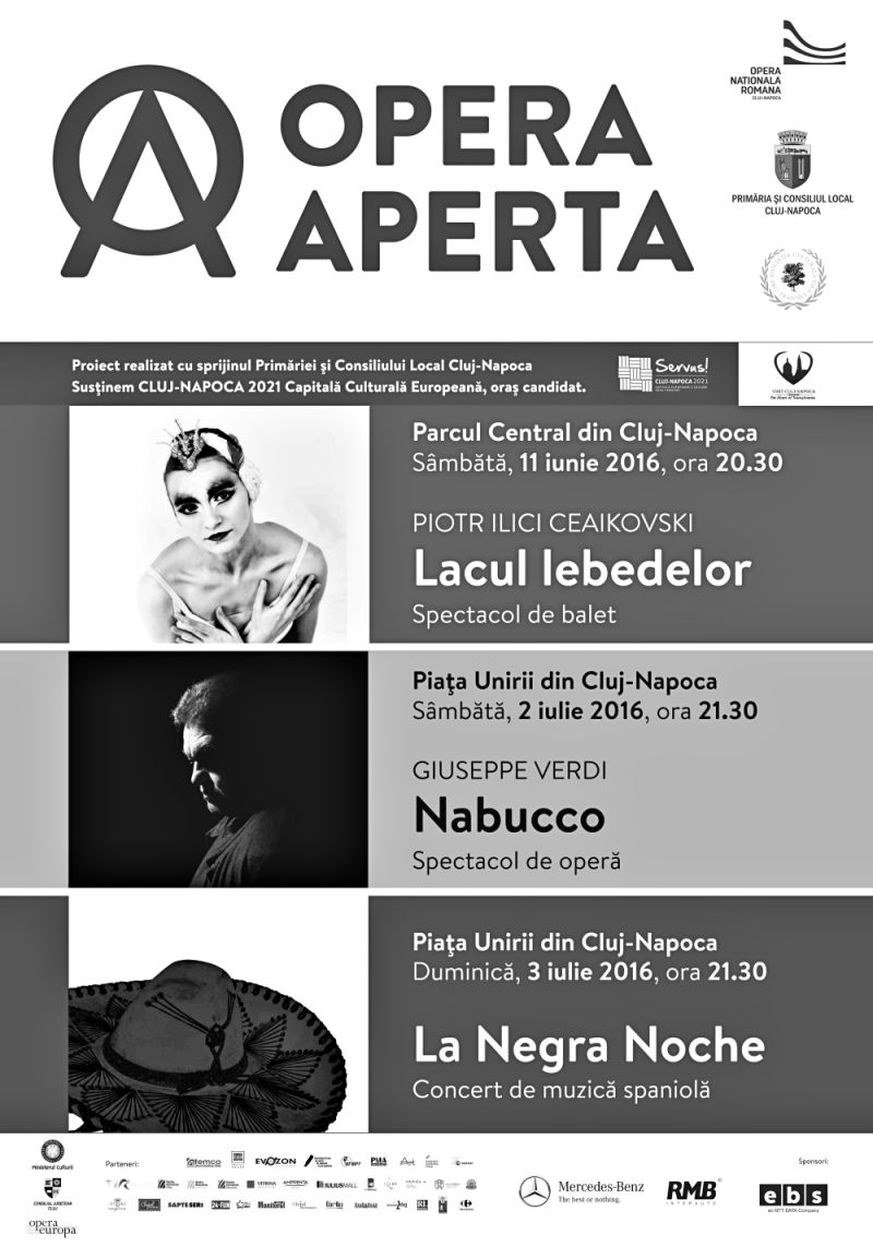 Teatrul liric din Cluj continuă trilogia spectacolelor-eveniment OPERA APERTA 2016, începută cu magnificul ”Lacul Lebedelor”, prezentat în premieră pe Lacul Chios din Cluj, pe data de 11 iunie a.c.,  încununând ediția acestui an cu două ocazii lirice la fel de strălucitoare. Spectacolul de operă ”Nabucco”, de G. Verdi (pus în scenă Sâmbătă, 2 iulie) și Concertul de muzică spaniolă ”La Negra Noche” (Duminică, 3 iulie)  vor aduce pe inedita scenă clujeană distribuții de excepție, formate din artiști consacrați ai teatrului liric clujean, acompaniați de invitați speciali de renume internațional:soprana de origine sârbă Dragana Radaković, baritonul mexican Carlos Almaguer, Szabó Balint, și dirijorul italian David Crescenzi.