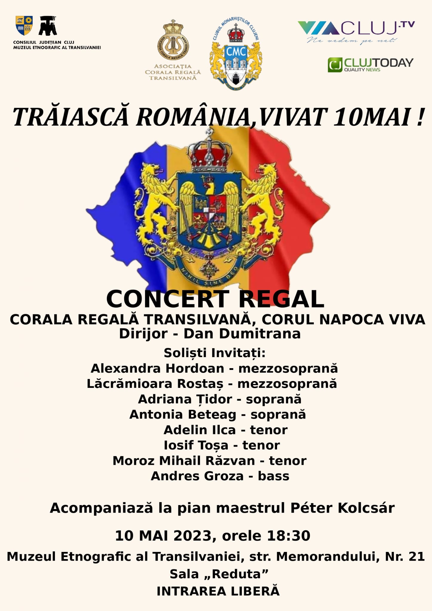 Muzeul Etnografic al Transilvaniei, instituție publică de cultură care funcționează sub autoritatea Consiliului Județean Cluj, în colaborare cu Asociația Corala Regală Transilvană și Clubul Monarhiștilor Clujeni, vă invită miercuri, 10 mai 2023, ora 18:30, la Concertul Regal „Trăiască România, Vivat 10 mai”.
